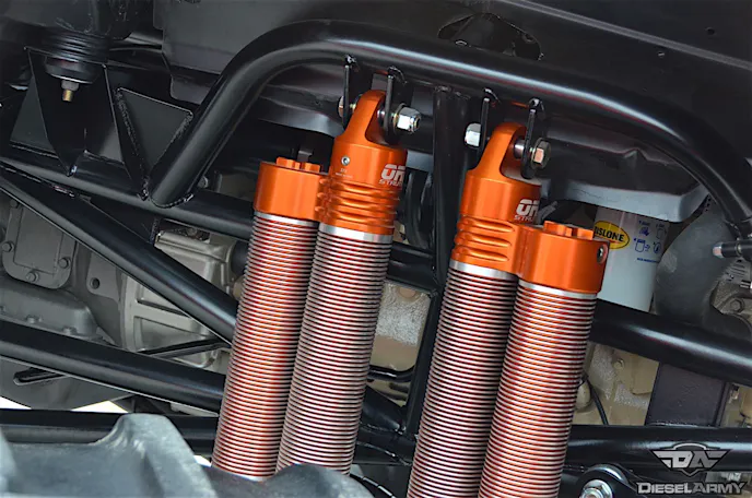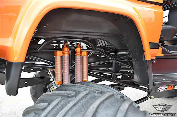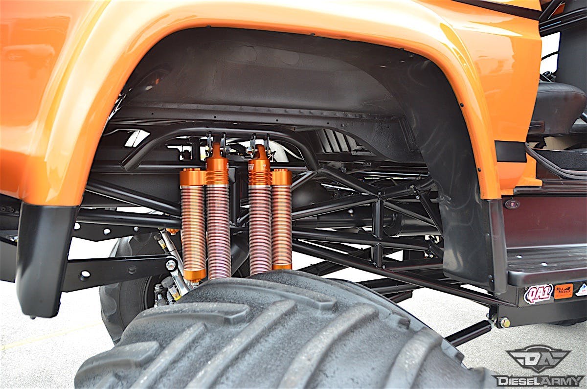 The body was placed on a frame setup similar to the one on the Adams’ use for their monster trucks. Along with MRAP axles and four-wheel steering the team used eight ORI nitrogen shocks to hold up the massive weight the body put on the suspension.