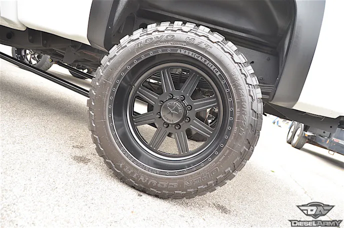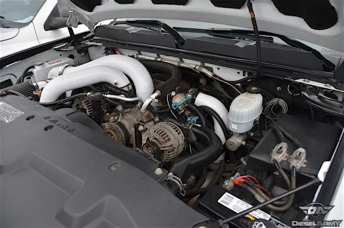 The truck is loaded with parts. “The truck has an S467.7/83/.90 paired with an S483/97/1.32 with billet wheels and a water-to-air intercooler setup,” Petrick said. “All the piping was made in-house at the shop I work at, TSI Diesel and Performance.”