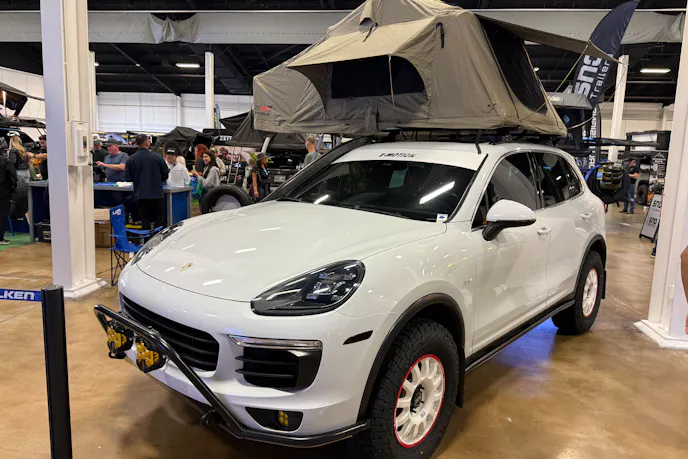 This is E-Motion Overland’s Porsche Cayenne diesel overlander. It has BRAID beadlocks over meaty tires, a 23Zero rooftop tent, and a custom bull bar with lights. It even carries a full spare tire on the back. Who say a luxury vehicle can’t get a little rowdy?