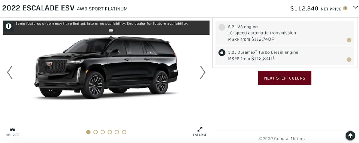 The Escalade comes in many different options, but we obviously want to focus on the diesel packages. More specifically, the Sport Platinum. Of the five available options, the Sport Platinum is the highest. Besides the obvious name, the price gives it away. We started selecting our Escalade ESV (Escalade Stretch Vehicle), chose four-wheel-drive, and then moved on to highlighting the 3.0-liter Duramax diesel engine option. With those selections, the price came in at $112,840.