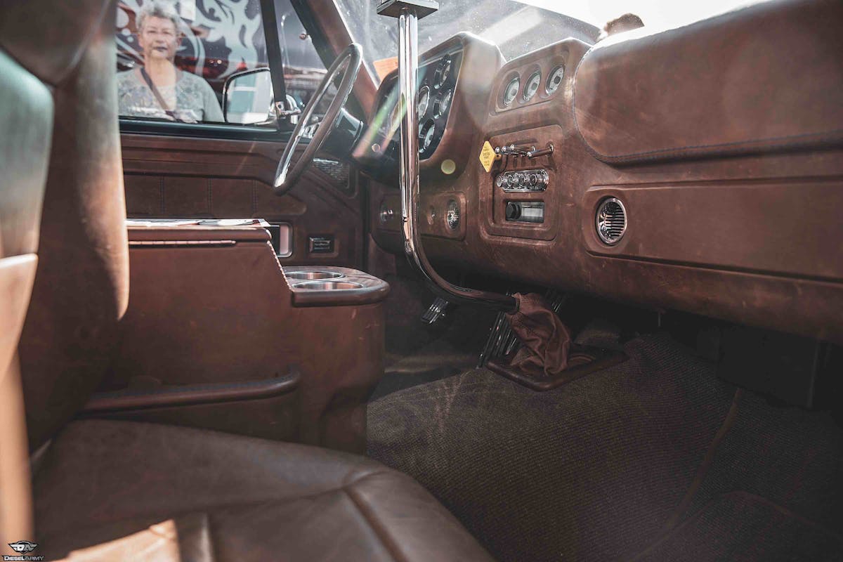 “We covered this truck in custom parts and the list seems to go on forever. For instance, we’re running a set of Nathan KL5 train horns, Accuair E-level system, custom air-ride seats to fit the lowered floor, custom door panels, and ISSPRO gauges throughout. There are no Dodge parts inside this truck. We have replaced parts with either different brand items or custom pieces.” Other features include 300-psi air gauges, air-actuated service and parking brakes, a 6-inch exhaust stack, Peterbilt pedals, switch, and stereo. It took five full cowhides to create the interior.