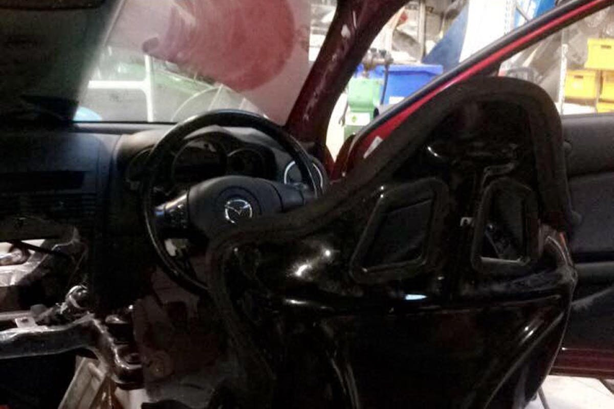 Since that time, Comhghan has been on the winning side of the argument. “We’ve been building since June of this year,” he said. “So far, we’ve stripped the car, modified the chassis to take the added weight and torque of the Cummins, fitted a BMW E36 steering rack, fabricated a custom driveshaft to the RX-8 differential, installed drift-style wheels and tires, moved the cooling system to the rear, and installed a bucket seat.”