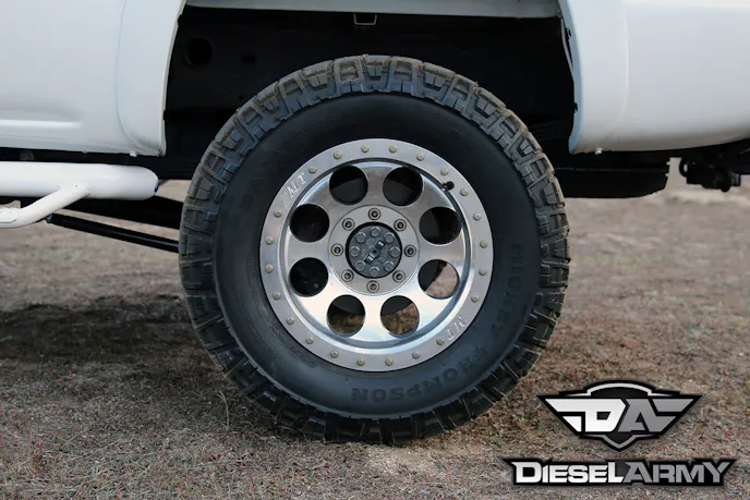 As for the suspension, the rear overload springs were removed, a 4-inch block was added, and then a set of Sulastic shackles were used to hang the rear springs. Caltrac traction bars from Calvert Racing help keep the rear axle from rotating under all that power. Up front, a Fabtech 6-inch suspension lift kit gets the truck’s nose up and provides plenty of wheel travel. With the suspension mods in place, Barnes was able to mount a set of 325/65-18 Mickey Thompson Baja ATZs wrapped around 18-inch Mickey Thompson Classic Lock wheels.