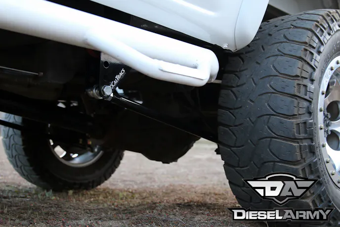 The truck has undergone a complete re-do since those early years, as the stock steering system was swapped out for a Red Head steering box, Cognito brackets, Rare Parts tie rods, and a Moog idler and pitman arm to beef it up. Dirty Hooker Diesel braided stainless power steering lines feed the system fluid to make it all go.