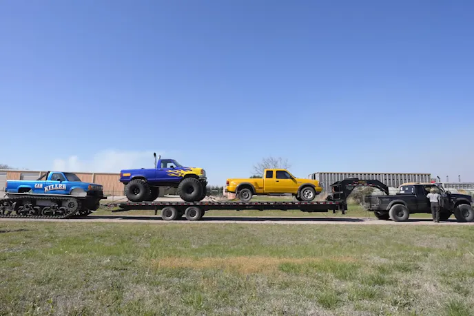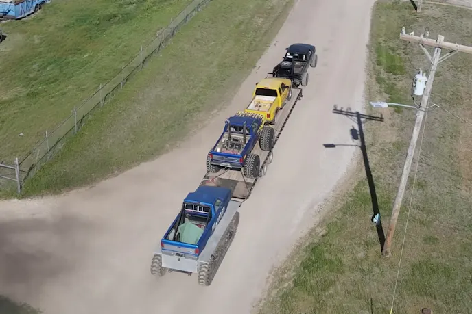 After sorting out how to engage the four-wheel drive, the Cummins Ford Ranger easily dragged the monster truck. The real spectacle involved towing tests using the truck’s gooseneck hitch. First, it easily pulled a large trailer loaded with two other Ford Rangers, weighing over 20,000 pounds. Champlin noted, “it pulled it perfectly; it didn’t struggle at all.” Seeking a bigger challenge, he then chained his colossal “Battle Tank Ford Ranger” (estimated at over 30,000 pounds) behind the already loaded trailer, putting over 50,000 pounds behind the Cummins Ford Ranger.