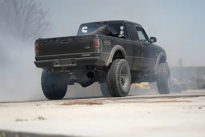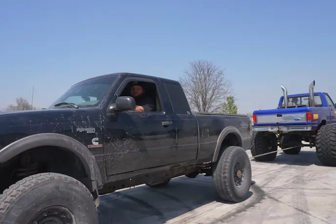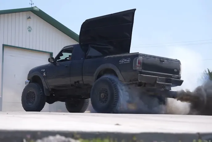 Champlin found the pre-swapped Ranger via Facebook Marketplace and immediately embraced its rough-and-ready nature. He declared, “this is my style, it’s junk and I love it.” After confirming its burnout potential (which violently removed the tonneau cover), he subjected it to a tug-of-war against his own massive big-block powered Ranger riding on 49-inch tires.