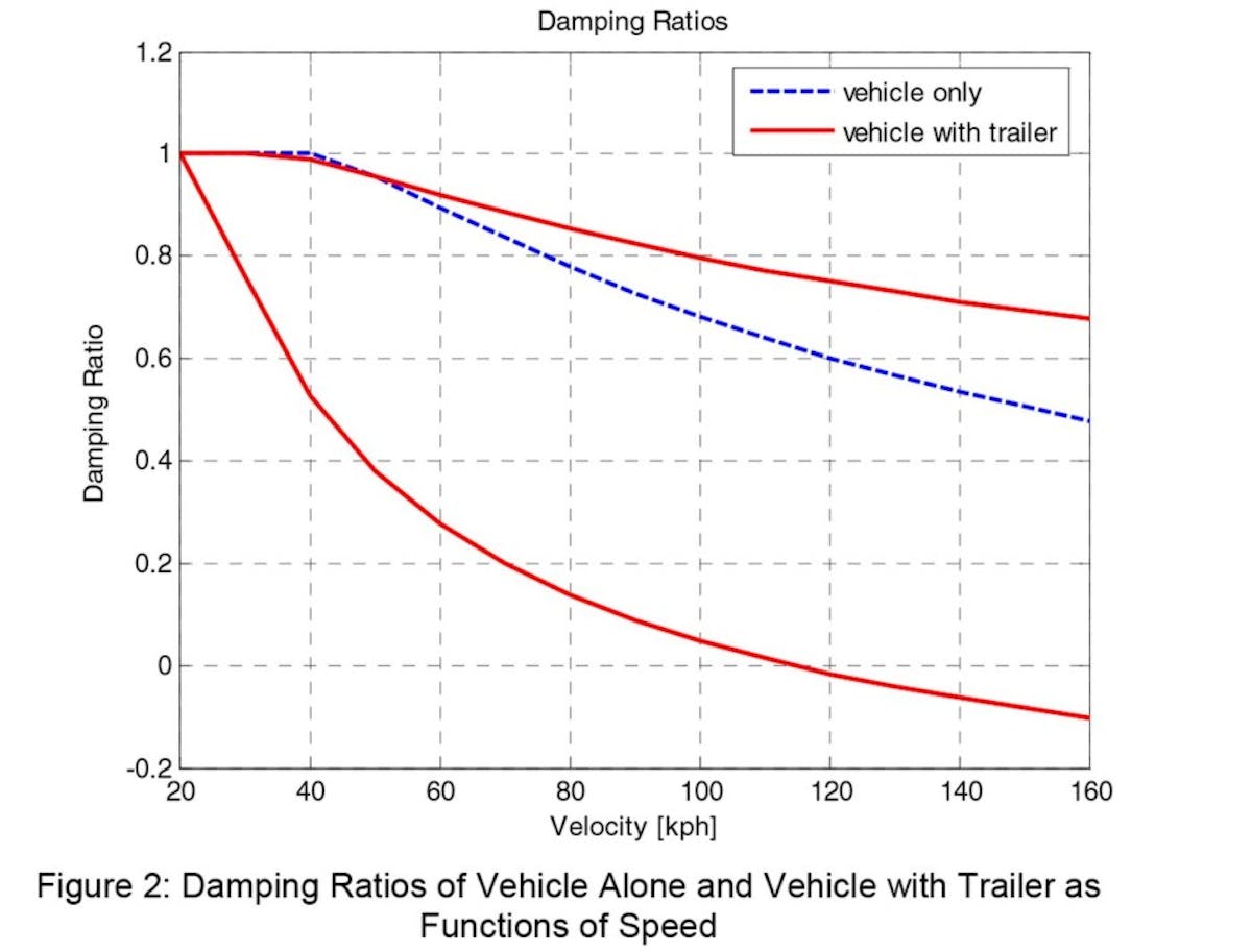 The math showed that a low tongue weight would produce a negative damping ratio around 71 mph and a higher tongue weight stayed positive until over 100 mph. When they tried this in a controlled test, the real world backed up the math – low tongue weights mean unstable trailers at freeway speeds.
