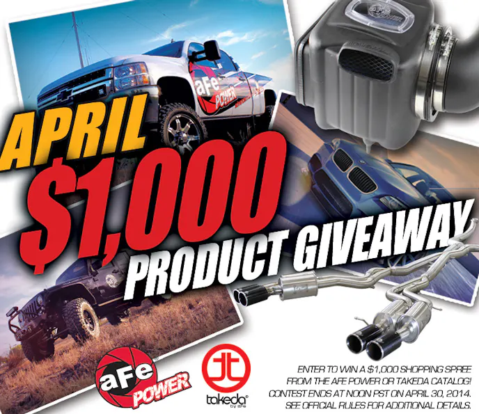 aFe Power is giving away $1,000 in the month of April. Not $1,000 in cash, but products. The winner will have the ability to pick up aFe Power or Takeda products. (If you aren’t familiar with Takeda, don’t worry. They are an aFe brand, but pretty much only cater to the import market.)