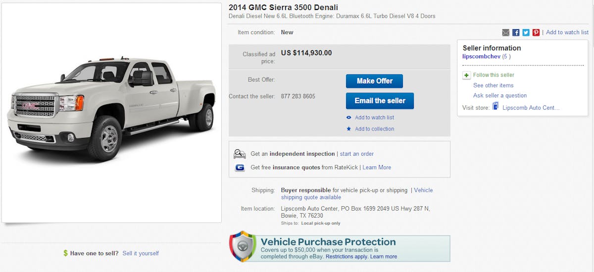 Recently we found a listing on eBay for a $100,000 bone stock, production truck being sold by Lipscomb Auto Center in Bowie, Texas. The truck is a 2014 Sierra 3500 Heavy Duty Denali that is a crew cab long bed dually. The truck does feature a 6.6 Duramax with a 6 speed Allison behind it and it is 4 wheel drive with navigation and lots of other options. Still, is being one of the first people to buy a 2014 Denali worth 100k?