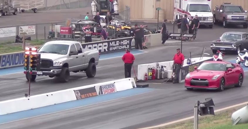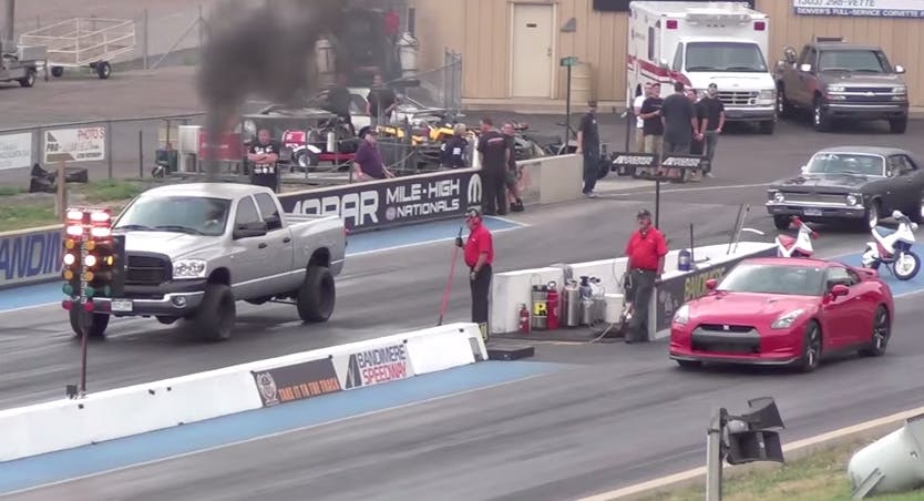 Even though the Ram gets spanked at the line. Clearly, the Ram was preoccupied or something. For all we know could have been a perfect time to take a “selfie”. Then the Ram driver finally wakes up and gets his foot off the brake pedal, he is finally off. The race is neck in neck for most of the run until the end. The Ram pulls ahead and reminds the GTR what turbo diesel power actually looks like.