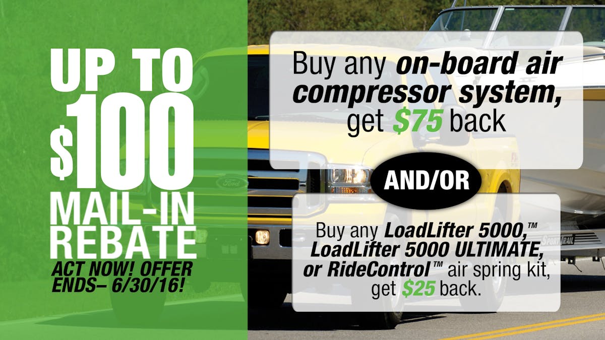 Air Lift has been offering a wide range towing product since 1949. They are now offering a mail-in rebate of up to $100 through June 30, 2016 to save on its line of air spring kits and compressor systems.