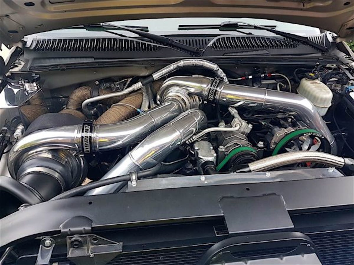 Some of the major modifications to Cervi’s truck include a fully built Wagler Competition Engine, Limitless Diesel Performance five-speed Allison Transmission, and S&S Diesel Motorsports fuel injectors and cp3 injection pumps. Forcing huge amounts of air into the engine is a set of Forced Inductions turbochargers.