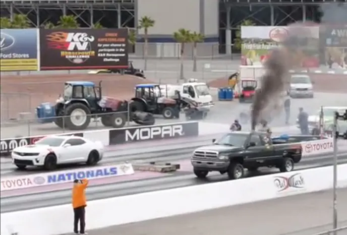 He does a big burn out. His adrenaline is flowing pretty good. He is probably all smiles as the light turns green. He jumps off the line well ahead of the Dodge. All is right in his world, but then all is wrong as he not only gets passed, but spanked by this 4 wheel drive beast.