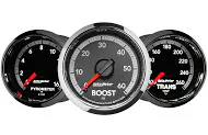 • Gauges and instruments include: boost, pyrometer (EGT), Transmission Temperature, Fuel Pressure, Fuel Rail Pressure, unique pointers, dial artwork, color matched LED backlighting, and chrome bezels