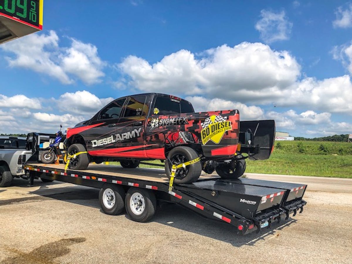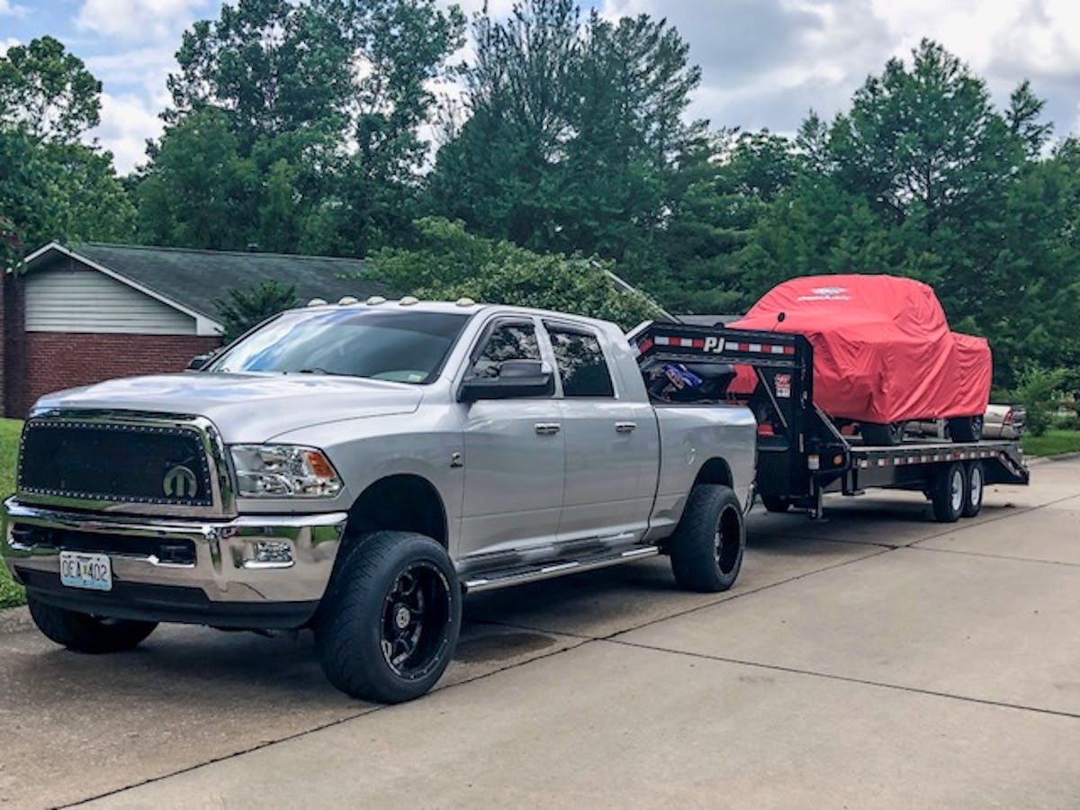 With the extra length of the mega cab and the shortness of the bed, it was important to protect the cab from the trailer. While most jackknifing accidents happen with square front car hauler type trailers, we weren’t going to risk it. With the help of our four-inch extender, it put our trailer that much farther away from our cab ensuring it would be safe in sharp turns.
