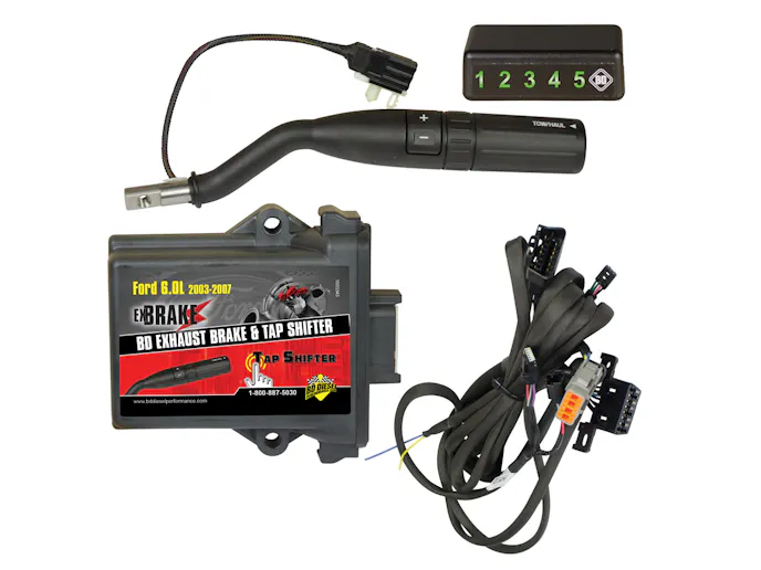 Access all 5 gears with a tap of your finger plus added engine retarding for better control on descents and curves. Control lock-up clutch for towing and dyno testing and have the versatility for overdrive control for slower driving in town. Module comes standard with turbocharger geometry control that turns the variable vanes in the turbo into an exhaust brake. BD’s Ford 6.0LTap Shifter comes complete with the new Ford OE 6.7L style shift lever, steering column wiring harness with factory connections and mini/dimmable gear selection display. The perfect match for towing 6.0L Power Strokes and is great for stock applications and compatible with most tuners.