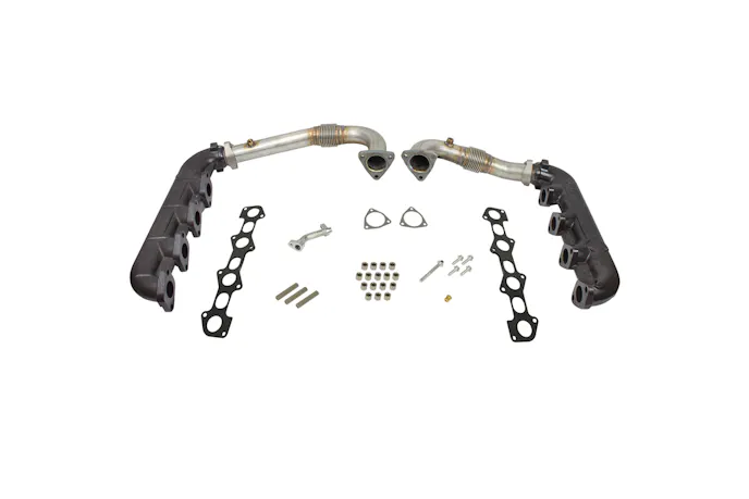 6.4L UpPipes kit includes thick walled exhaust manifolds that have the 90-degree outlet elbow cast design replacing the stock thin walled 6.4L feed pipe with its elbow that burns through quickly. BD manifolds hold in exhaust gas temperatures, enhancing turbine pumping efficiency, while the runners have been optimized to improve velocity and evacuate the cylinders. Manifolds are coated to resist corrosion and are pre-drilled for pyrometer probes. The 304 Stainless Steel feed pipes feature a mandrel-bent flow design for improving exhaust velocity and turbo response time. Kit comes with A/C adapter to offset and eliminate burning of the A/C hose.