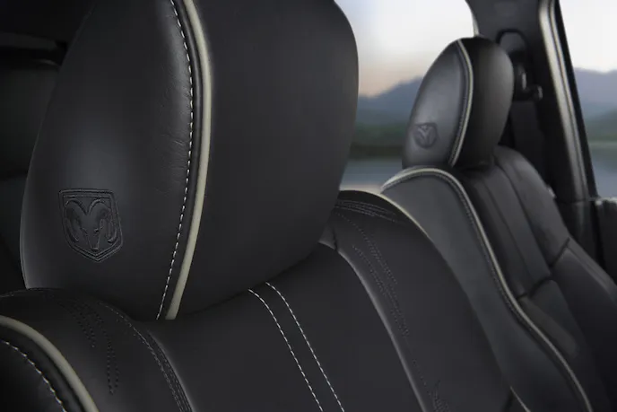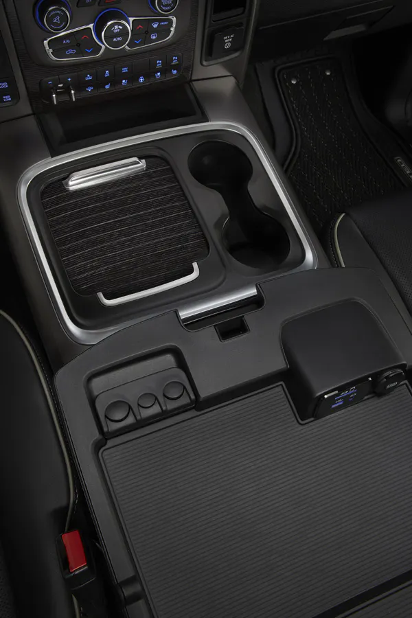 This truck has so much more to offer than just looking hot. It comes fully loaded beyond compare on the interior. Once you glance inside you are instantly drawn to the all-black premium leather cockpit with unique pinstripe stitching. Unique features like a rear flap-closure map packet with modern chrome Ram lettered buckles were also added. Even the center console has been brought up to the lap of luxury complete with double stacked french stitched full leather lid and limited badge covering the USB, Auxillary and 12-volt service points. A new bin was added to this plush interior in front of the console to house a cell phone and tablet holder concealed with a tambour wood sliding door. The theme of everything in the cab is leather, leather and more leather at the highest of qualities. The gauges had a lot to live up to with this high end interior so, what better what them to make them diam knurled. The gauges are graphite-faced surrounded with diamond knurled liquid chrome rings styled from some of the most exclusive high end watch designs.