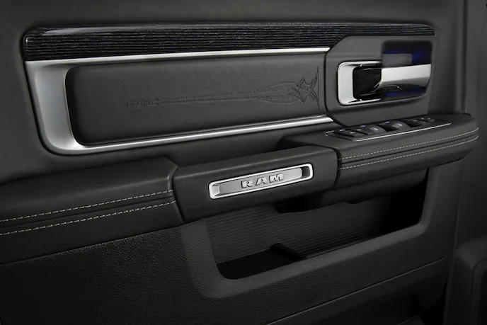 This truck has so much more to offer than just looking hot. It comes fully loaded beyond compare on the interior. Once you glance inside you are instantly drawn to the all-black premium leather cockpit with unique pinstripe stitching. Unique features like a rear flap-closure map packet with modern chrome Ram lettered buckles were also added. Even the center console has been brought up to the lap of luxury complete with double stacked french stitched full leather lid and limited badge covering the USB, Auxillary and 12-volt service points. A new bin was added to this plush interior in front of the console to house a cell phone and tablet holder concealed with a tambour wood sliding door.  The theme of everything in the cab is leather, leather and more leather at the highest of qualities. The gauges had a lot to live up to with this high end interior so, what better what them to make them diam knurled. The gauges are graphite-faced surrounded with diamond knurled liquid chrome rings styled from some of the most exclusive high end watch designs.