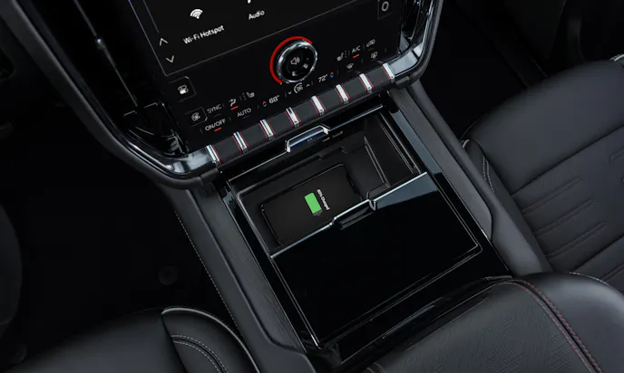 The seven-seater off-roady AT4 Ultimate has a front skid plate, 20-inch wheels wrapped in all-terrain tires, and four-corner Air Ride Adaptive Suspension that provides an additional two inches of lift for more ground clearance. On top of this standard-fare AT4 attire, the AT4 Ultimate adds a uniqe Obsidian Rush with Red Accents interior, draping all three rows in full-grain leather and splashing in Ash Burl wood accents, open pore wood décor, AT4 Ultimate headrest logos, and leather rim steering wheel accents. There’s an 8.0-inch diagonal rear climate control touchscreen, too.