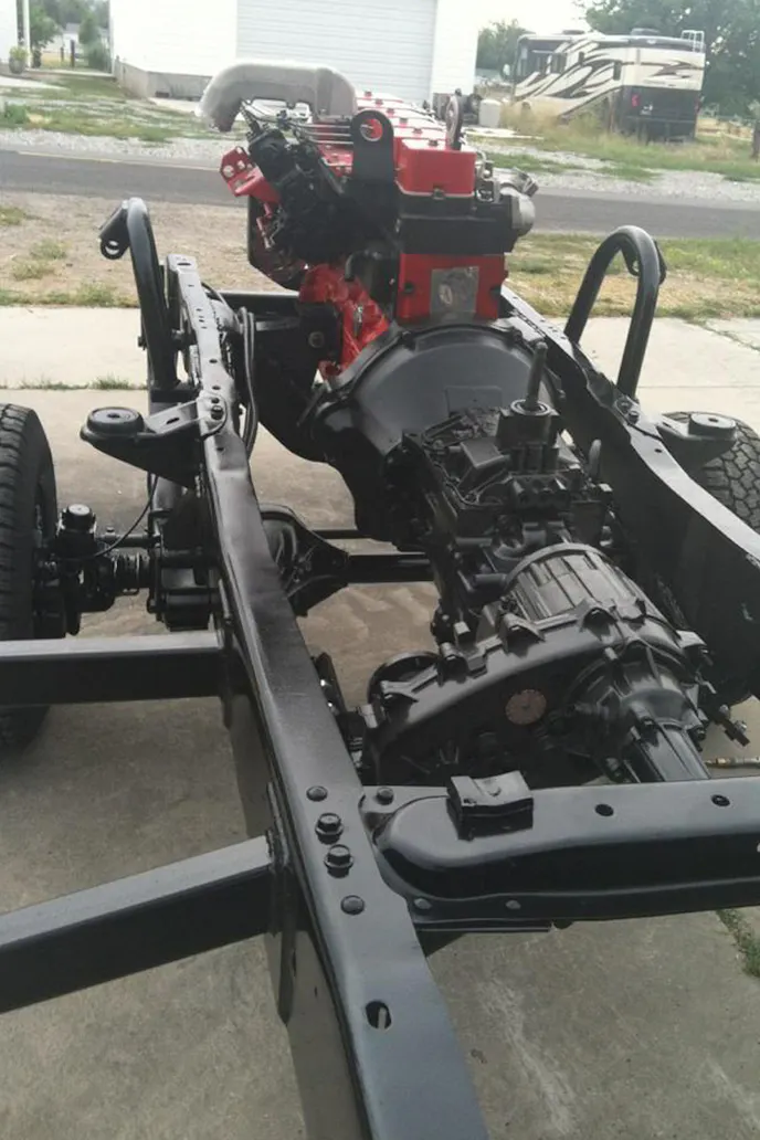 Not everything was that easy as Zack explained, “The rear axle was a different story. The third and final axle and springs were installed. Sitting on the AAM 11.5 rear she was sitting pretty. The steering box was relocated to the front of the frame. It took some time to disassemble the box, and drill and tap in the correct ports for hydro assist as well. I picked up an old a junk 6BT Cummins long block and bolted to the NV4500 manual trans as well as a NP241 t-case.”