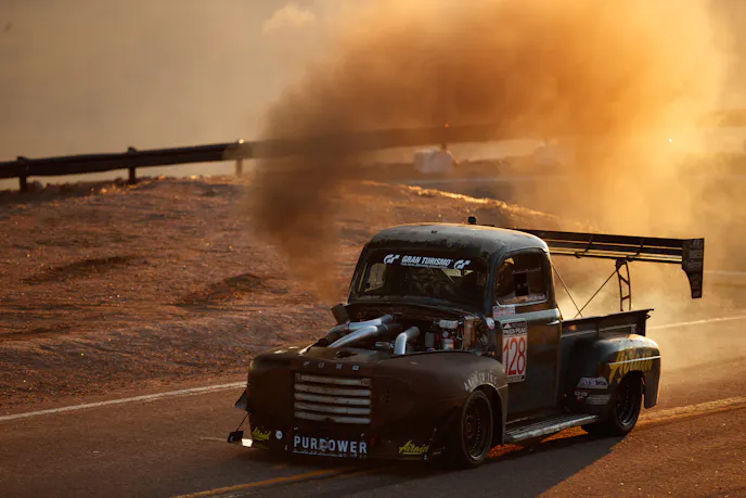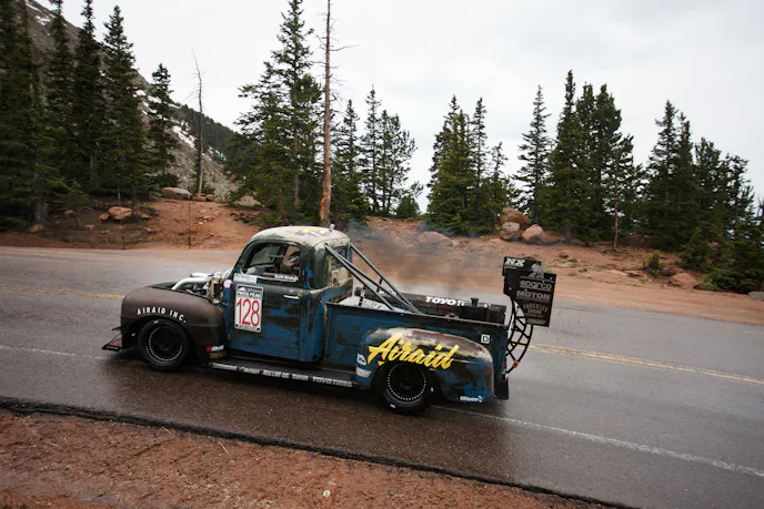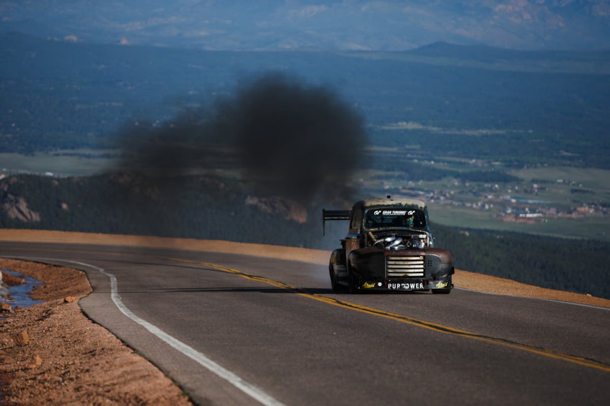 The Broadmoor Pikes Peak International Hill Climb, also known as The Race to the Clouds, is an invitational automobile and motorcycle hill climb to the summit of Pikes Peak – America’s Mountain in Colorado, USA held annually on the last Sunday of June. You can expect plenty of highly modified supercars, motorcycles, but one thing you don’t expect is a 1949 Ford F1 powered by a Cummins diesel engine.
