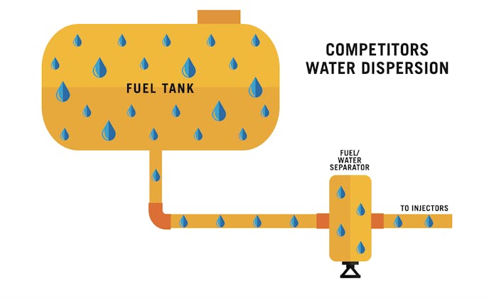 Many of our competitors try to disperse water in the fuel but that doesn’t remove it, it disperses it. It spreads it out throughout the fuel and it can then go exactly where you don’t want it: Into your injection system. Water cannot burn and it changes the density of the fuel being burned. Water will eventually corrode internal injection components over time. Dispersion also stops the fuel water separator from doing its intended job.