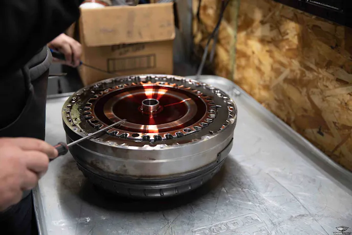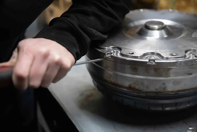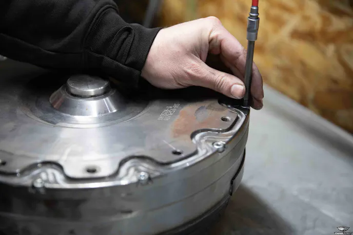 Because I want you all to see how easy this is, we’re going to show you exactly what was done to make these changes. First, thanks to the crew at Maverick Diesel, we’re using their workbench they use to do transmission work on and we got the converter set up on the table. Once we had it flipped over, it exposes all of the allen bolts that need to be removed to get this cover off.