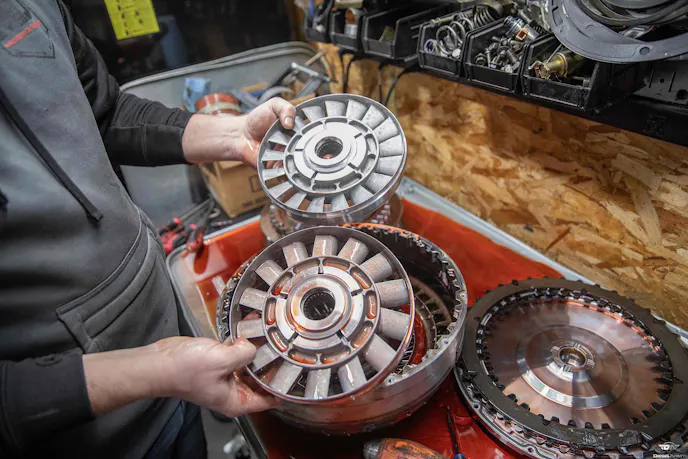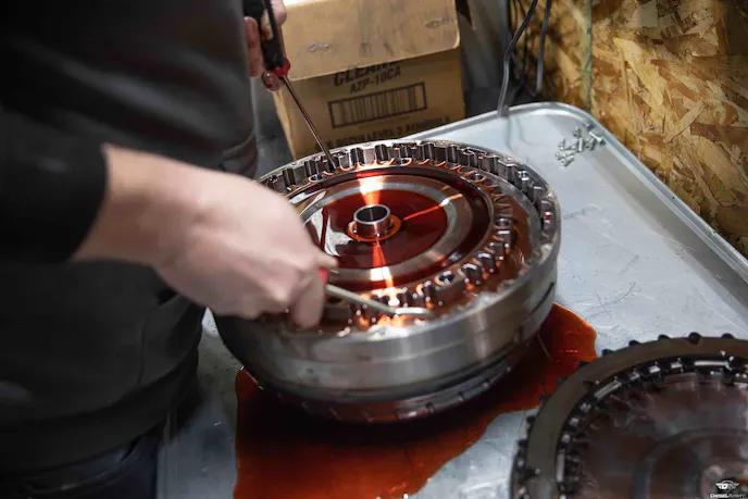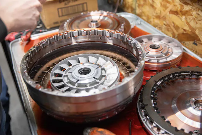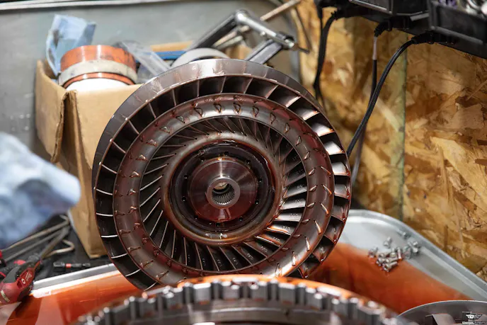 You will have your clutches, steels, stator, bearings, and the turbine inside. Once the outer shell is removed, or in our case, individual pieces taken out of the housing, you can see all of these parts. Be careful if you take these items out versus flipping the unit over. You can, and will, hurt some fingers.