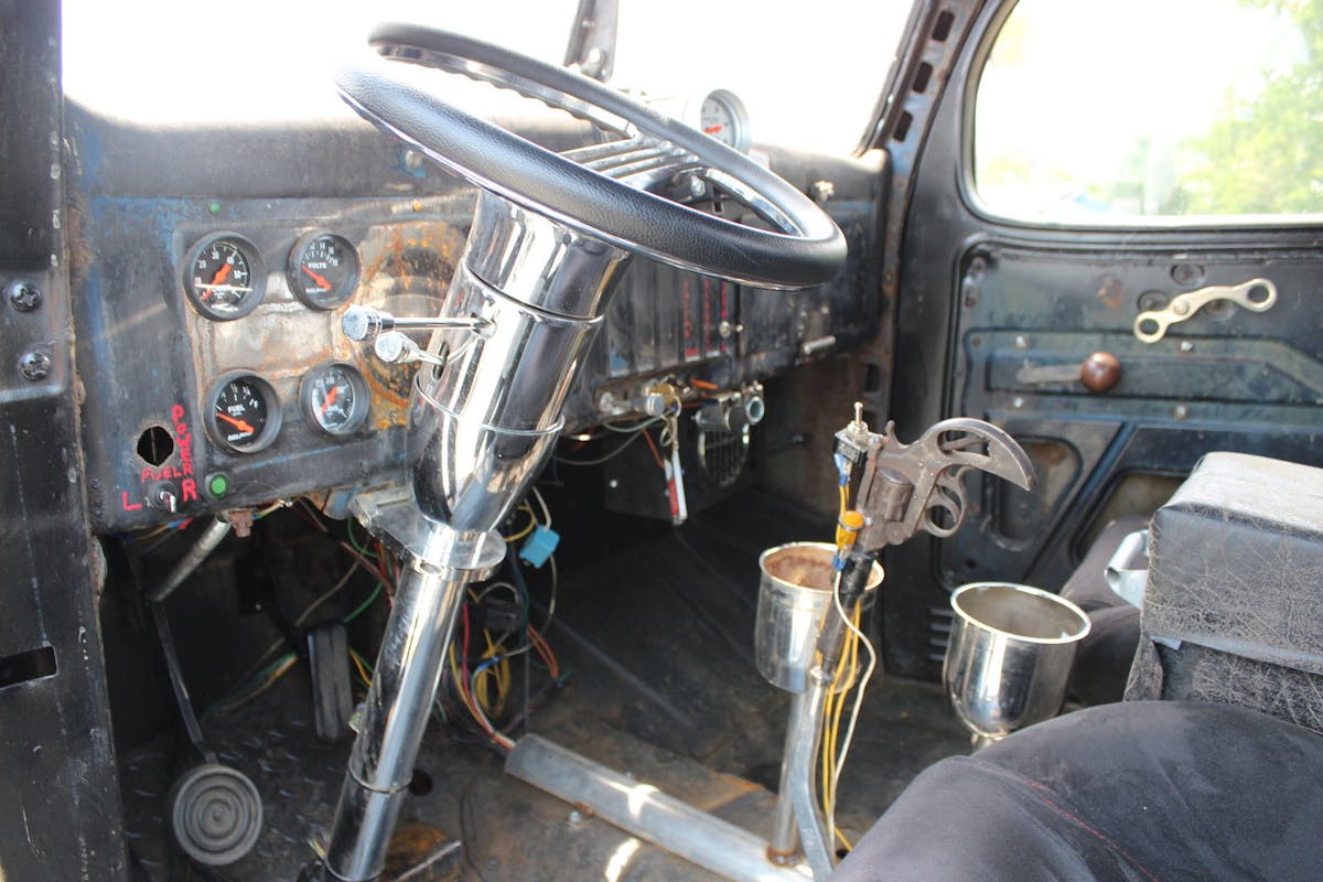 A suitably rough interior adorns this unique tow vehicle. Late model buckets, a modern steering wheel, and a few gauges are the only comforts in this steel cab. A rusty revolver frame offers the driver a good purchase on the shifter.