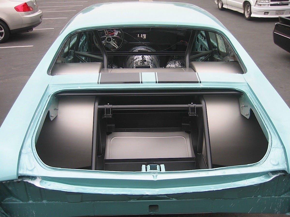 Lets start with the obvious, appearances. Chevelle Mist Turquoise is a factory 1970 color, verging on sea-foam or mint it is not necessarily the meanest looking color combo out there but none the less a fitting irony for this show stealing coal roller. The body was completely striped, and worked over including a 4-inch stretch to accommodate the huge rear tires. The custom aluminum sheet metal work is the fabrication craftsmanship of Fast Eddie Race Cars.