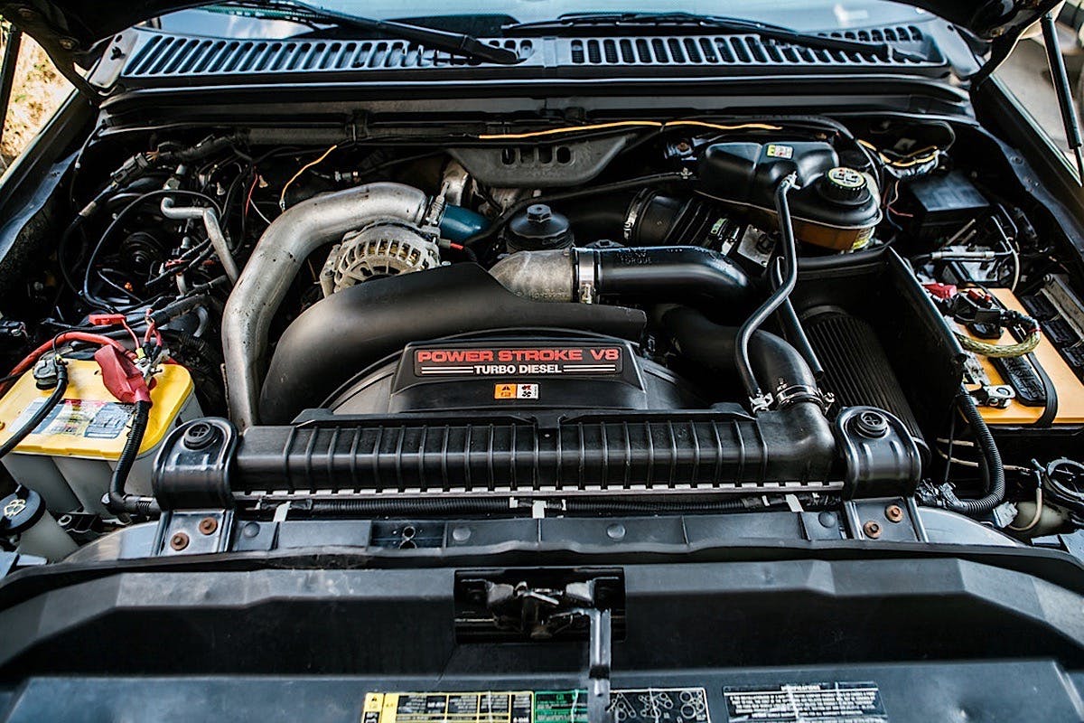 The bed features a carpet liner and teneau cover for some utility but a custom bubble-flared hood conceals the Powerstroke’s unknown modification extents.