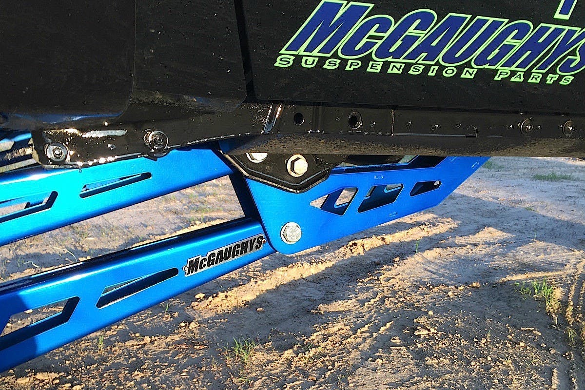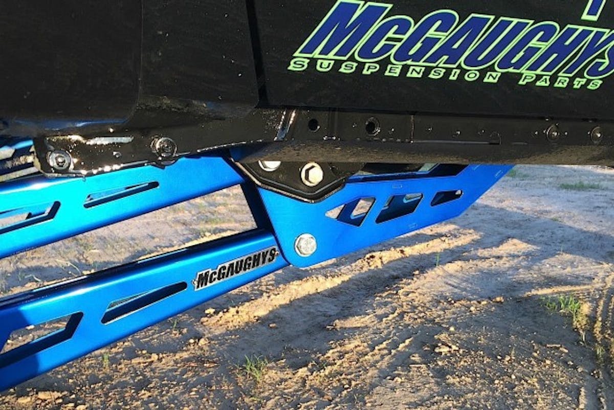 The suspension keeping this F-250 in the air is a McGaughy’s eight-inch lift, four-link, and rear trac bars. All of the links and suspension components have been powdercoated Peeka Blue for durability, and a pop of color. The front suspension is dampened by double Fox 2.0 remote reservoir shocks, mounted to a dual-hoop top mount. The rear end is dampened by Fox 2.5, double bypass shocks, with piggy-back reservoirs. The steering is also stabilized by dual Fox units.