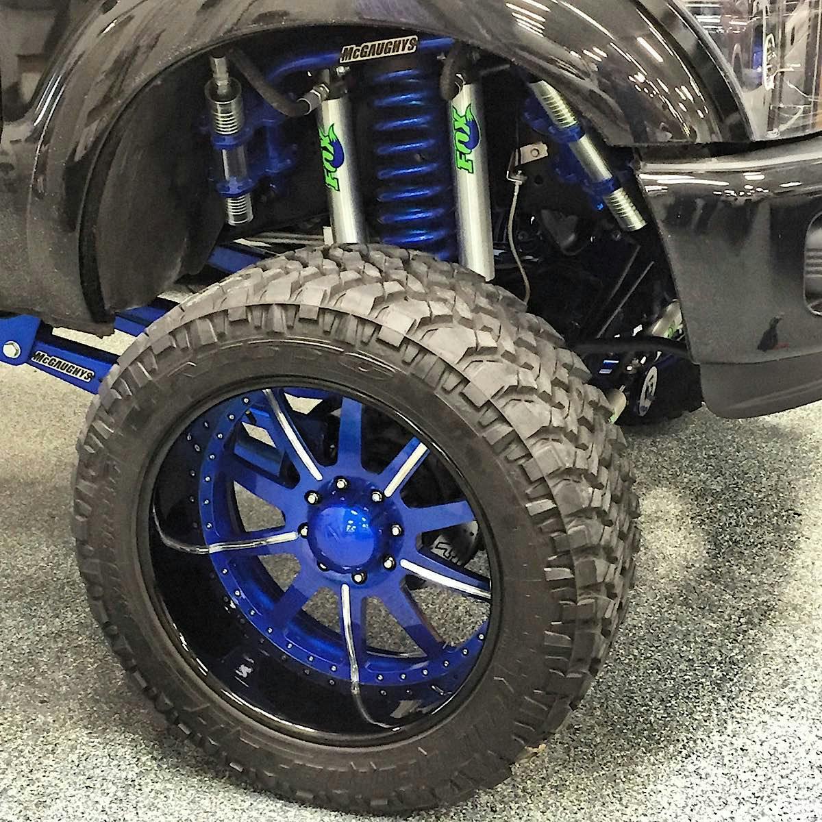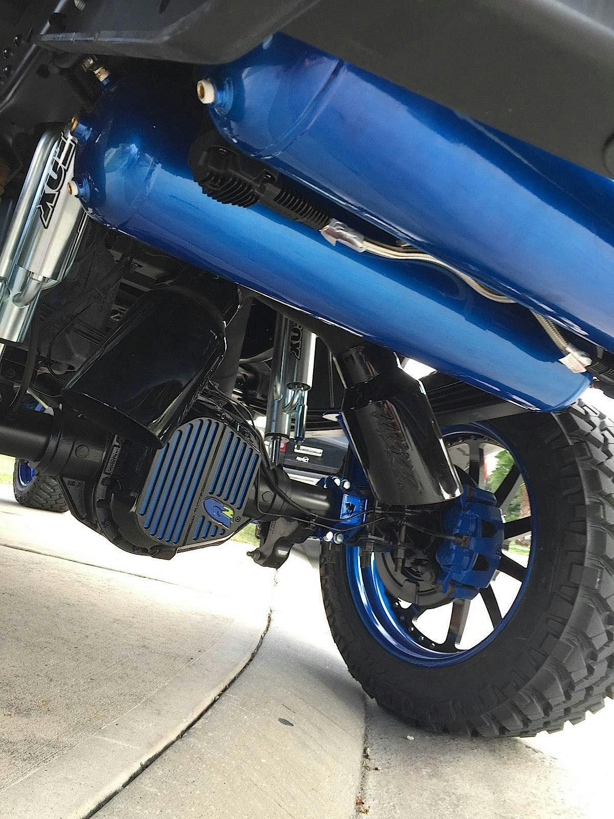 The wheels on this 2013 show truck are one-off customs from Intro, which measure out to 24×12 for a massive stance rolling on 38×13.5 Nitto Trail Grapplers. The wheels have been painted a Tru Blue Pearl to color-match the blue accents in the suspension, grille, and lights. Brakes to stop the mass of that rolling rubber were upgraded to R1 Concepts cross-drilled rotors, and aftermarket pads.