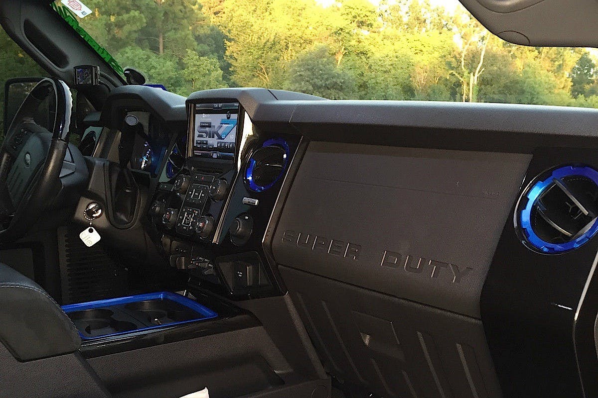 The color-matching and attention to detail does not disappoint as we move from the exterior, into the interior of this luxury diesel. Air conditioning bezels are color-matched tuxedo and pearl blue, as is the stitching throughout the upholstery. Door panels, arms rests, and seats all feature custom stitching and “SIK7” emblems can be found echoed from the front grille to the center console.