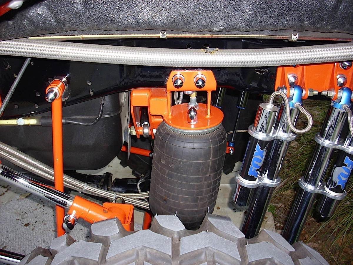 Keeping with the Harley Davidson aesthetic the custom suspension links and other undercarriage components are powdercoated orange and black. Chrome glitters from the Fox shock bodies to the four-link bars, and beyond, further announcing this trucks chopper style.