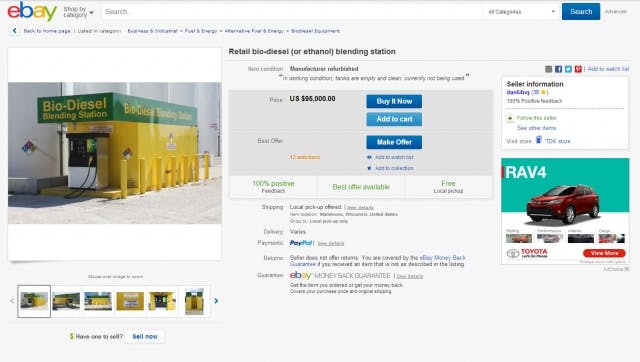This eBay seller is offering a free standing blending station that is able to blend B20, B50 and even B99. How is this possible? Well, there are two above ground tanks that are contained within the walls of the unit. One is a 1,000 gallon bio-diesel tank and the other is a 1,000 gallon regular diesel tank. Then the pump is pre-programed to mix the appropriate amounts of each right there at the station.