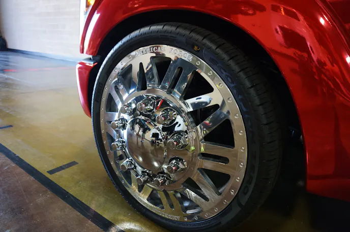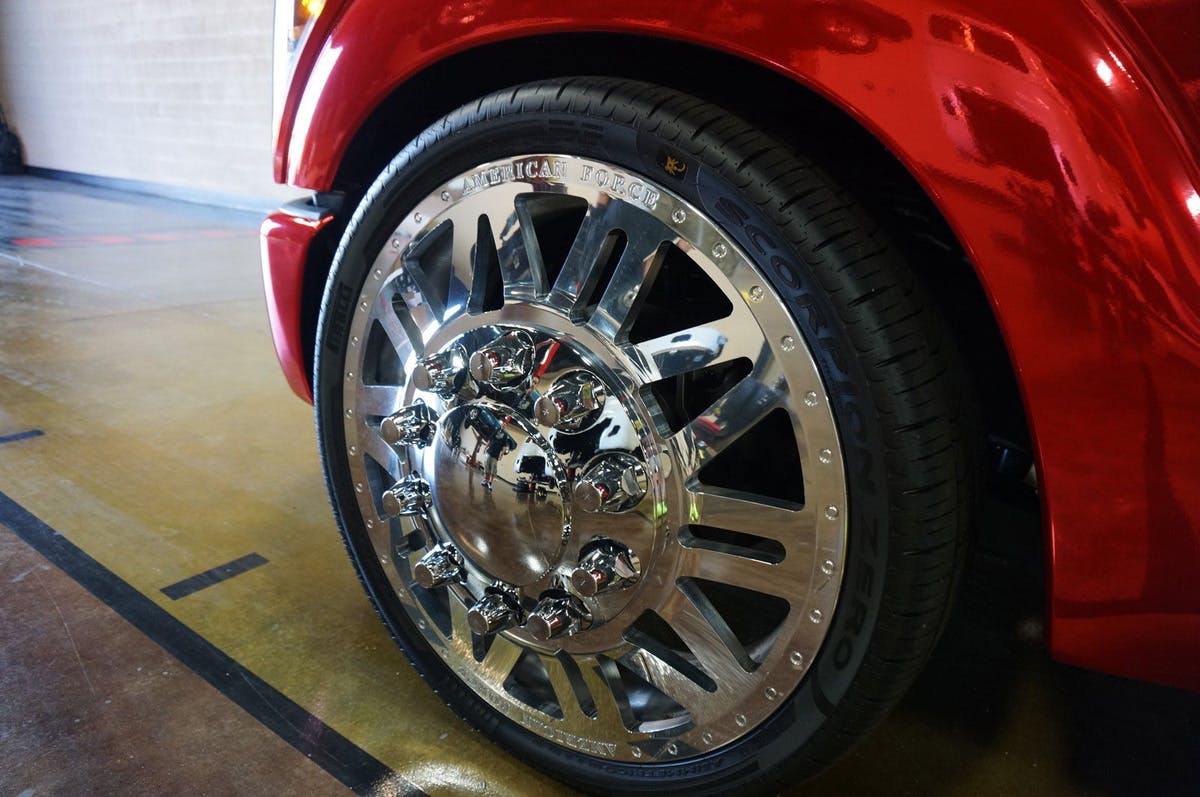 The truck is rolling on a set of 26 inch Scope wheels by American Force Wheels. They are wrapped with Pirelli tires. The exterior, also, features a rather cool and somewhat unique red chrome wrap to really set the truck off.