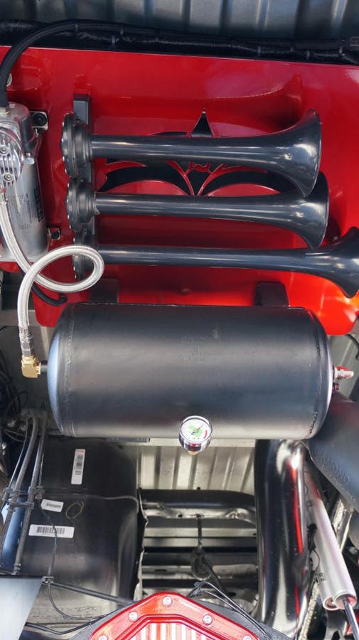 The rear tail lights were smoked and a set of Hornblaster train horns were mounted in the rear. To aid in the visibility at night, the front headlights were upgraded with a set of Elite Custom headlights with back lighting. A full treatment of Baja Designs LED lighting was, also, installed.