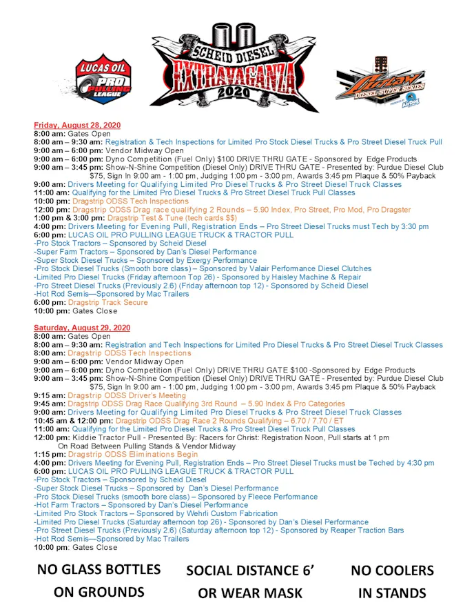 Finally, we are approaching another event in the Outlaw Diesel Super Series season. I don’t know about you guys, but these race / pulling weekends are just the getaway I need. The legendary Schied Diesel Extravaganza is back but things are more different than ever on August 28th and 29th. We are not only having this show at a new location, we’re having to abide by the current laws going on right now.