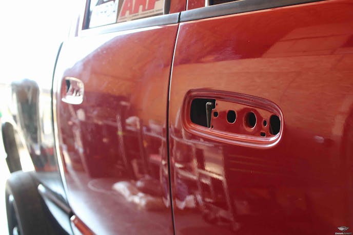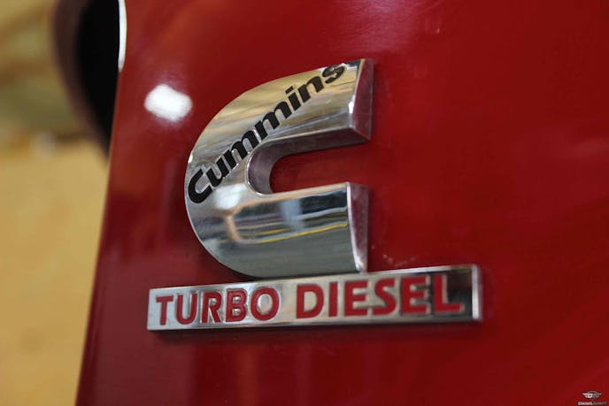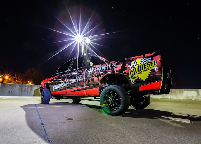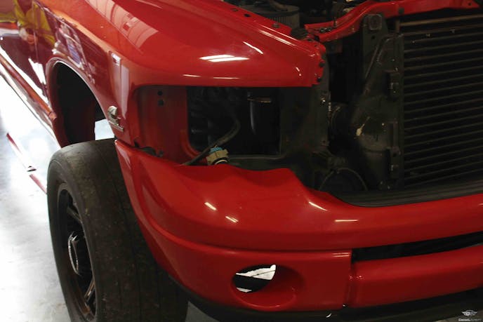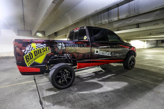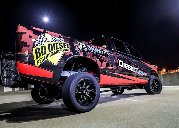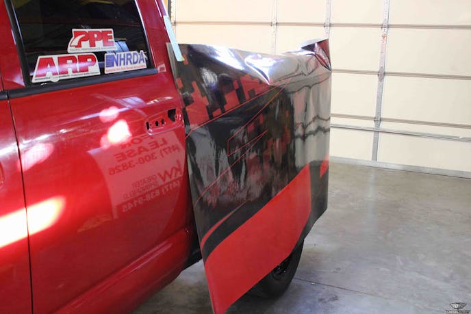 Although we were unable to wrap the grille and front bumper, we were glad we went ahead with doing a complete repaint of the parts. This way, the frontend parts will last much longer and won’t deteriorate due to an unsatisfactory wrapping surface. The big bedside decals were provided by BD Diesel Performance and really complemented the red and black.