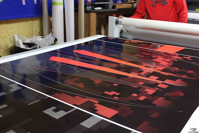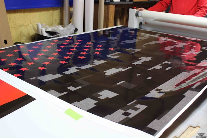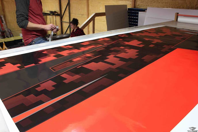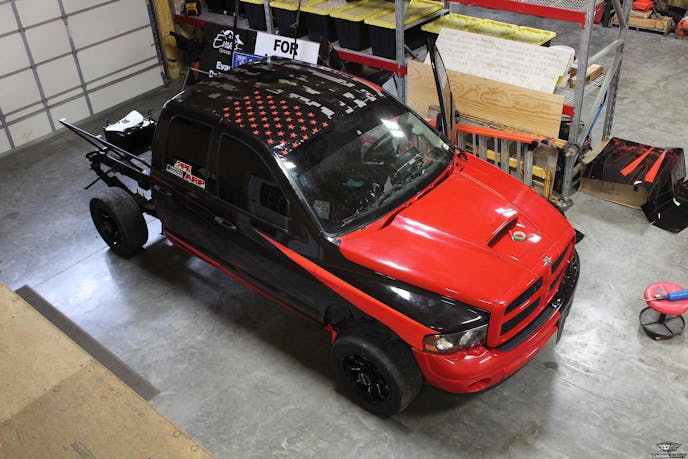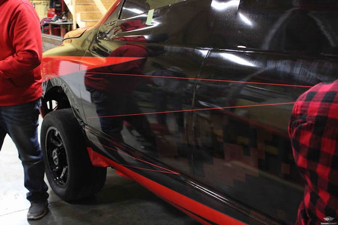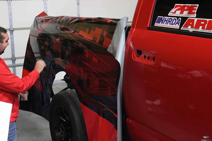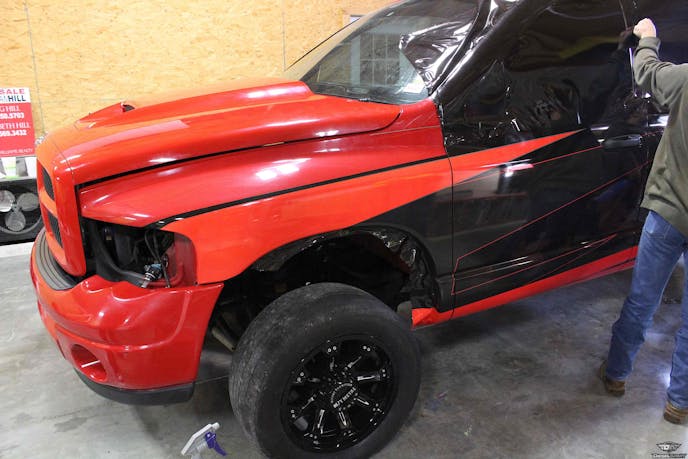 What is a wrap? A wrap goes over the exterior and consists of a thin, adhesive-backed vinyl material. It can be printed with almost endless design ideas. On our truck, Project Deadspool, we wanted a full coverage wrap with multi-colors of black and red, transitioning into digital camouflage print towards the back.