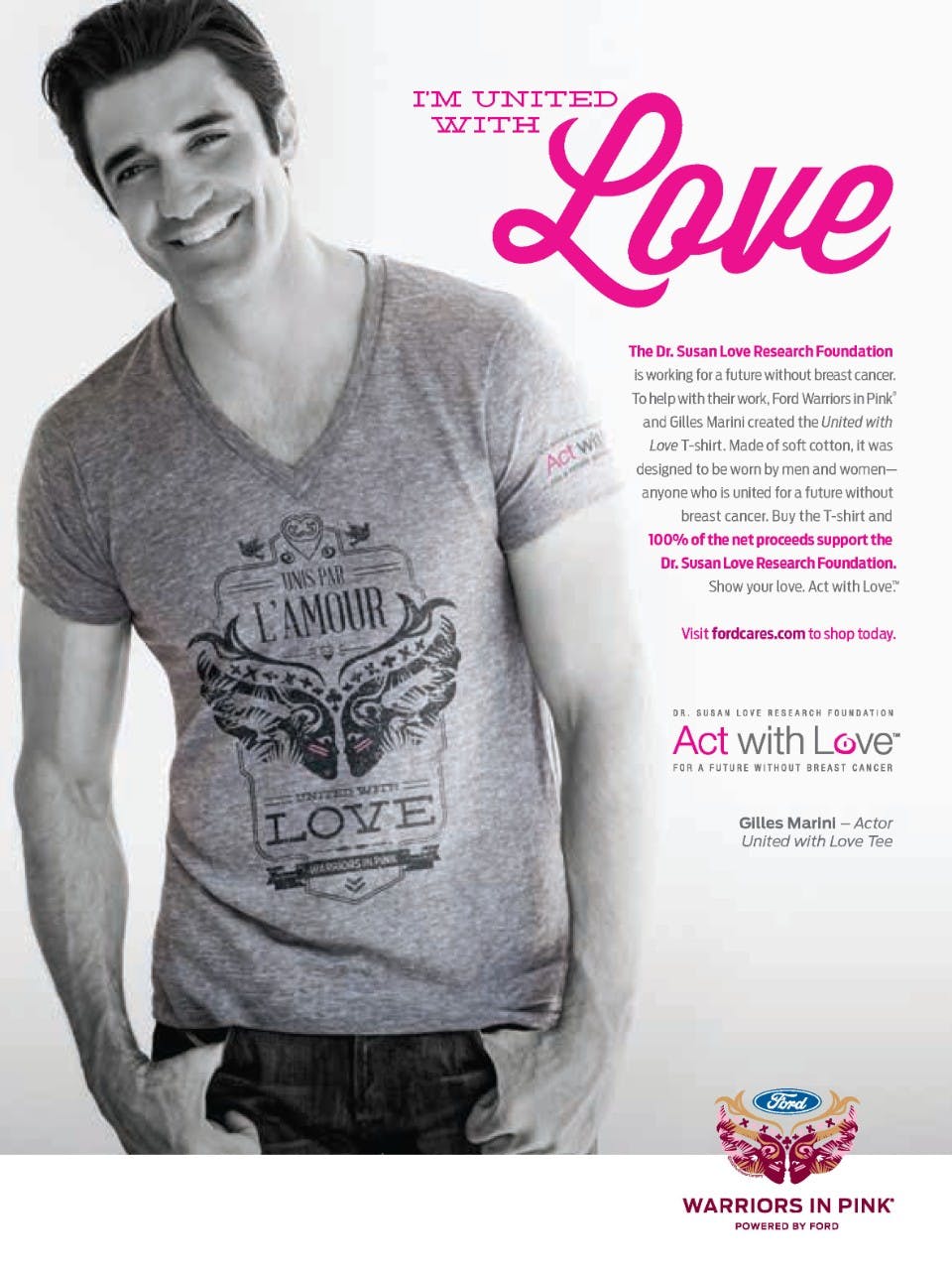 Ford Warriors in Pink®, the Ford Motor Company program that raises awareness and funds in the fight against breast cancer, has joined with actor Gilles Marini to create a limited-edition T-shirt to add to the 2013 Warriors in Pink collection. A full 100 percent of the net proceeds from the T-shirt go to the Dr. Susan Love Research Foundation, dedicated to finding the cause of breast cancer in order to eliminate the disease and create a world without it. Retailing for $20, the T-shirt can be purchased now at fordcares.com.
