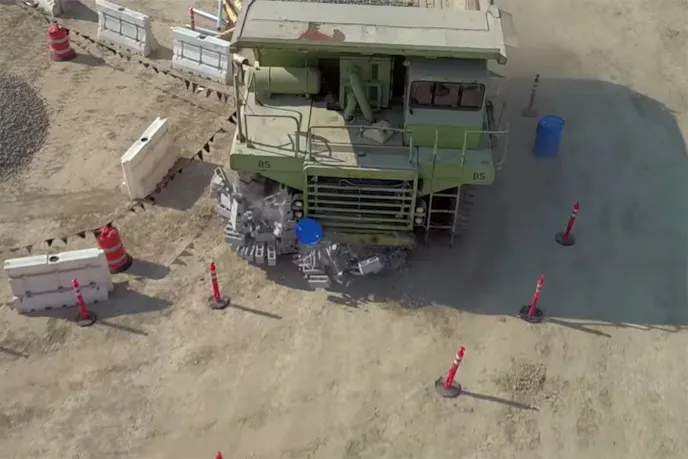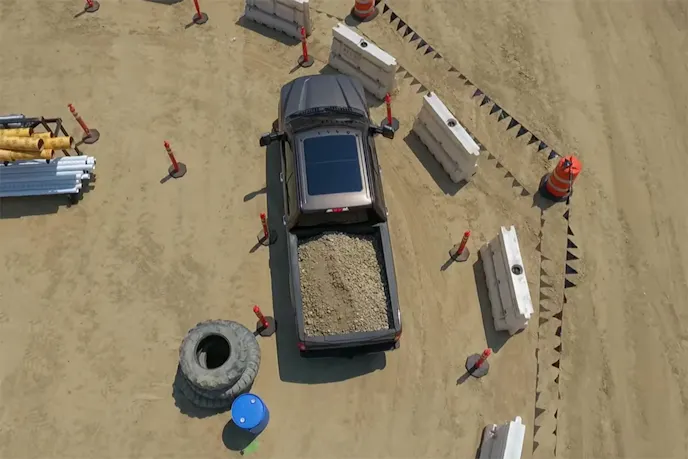 A pre-planned obstacle course shows the Super Duty, its bed filled to the brim with dirt and rocks, make it through tight turns and reach the end in perfect form. The earthmover, by contrast, merely rampages through the entire course, knocking over water barrels, guard rails, and cinder blocks.