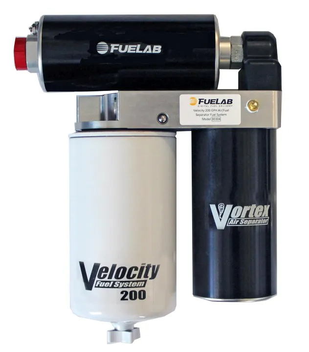 The innovators at Fuelab now offer their Velocity 200 In-Line High Performance Lift Pump for the 2008-2010 Ford 6.4L Power Stroke. Supplies the increased fuel demands of engines modified for more power. Premium quality, powerful, speed controllable and reliable replacement for the weak OE Ford lift pump. Brushless motor for long life and low current draw. Flow through design for cool operation. 200 GPH high flow rate and aerospace design based poppet relief valve provides stable fuel pressure to injector pump. No dynamic shaft seals ensure reliability. Vortex air separation and water/filtration system protects fuel injectors and provides pure fuel to engine. Pump is quiet, installs easily and uses standard replacement filter elements. Also available in 100 GPH configuration (Part# 30305). Hand-built in the USA. Thanks to increased demand Fuelab leverages volume production efficiencies to offer the Velocity Lift Pump series at a 10% price reduction for 2014.