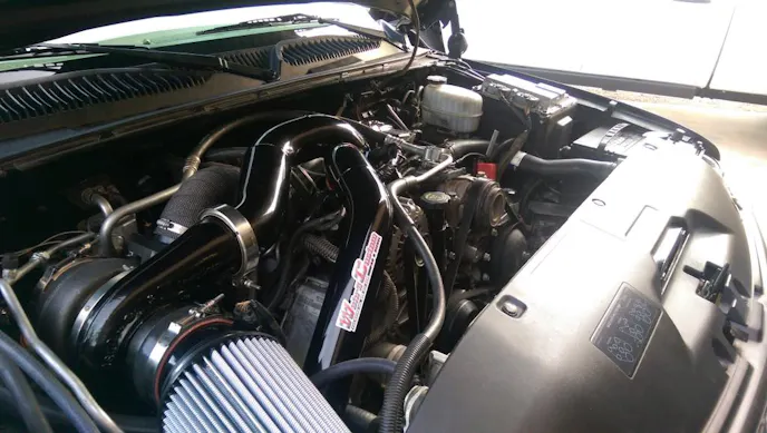At this point, the truck was fully assembled and running and it was time to have it registered as a diesel and not gasoline. With the installation of a catalytic converter, it was now road worthy and legal. Next on the list was the exterior. The stock hood was replaced with a cowl hood and the truck was sent off for a fresh coat of black paint. Stock wheels and tires would not fly so a set of stock 20″ wheels from a Tahoe were mounted to finish off the look he wanted.
