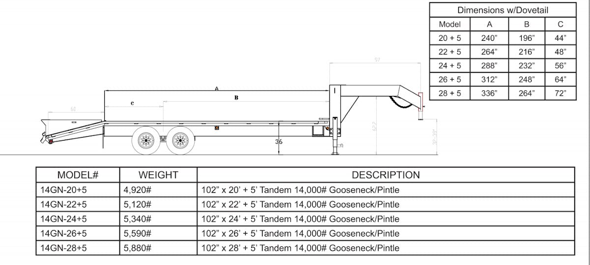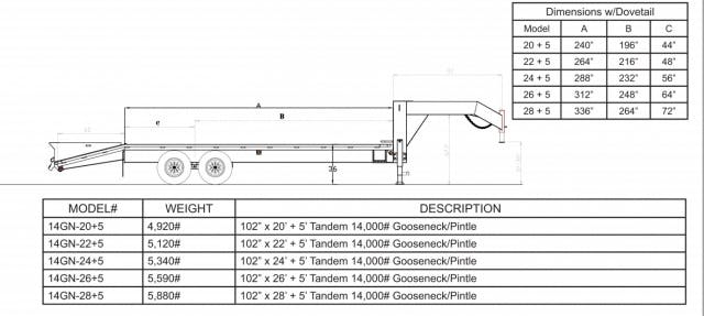 The lightest duty (if you can call it that) gooseneck trailer is their 14GN series. These are roughly 14,000 lbs trailer. Their G.V.W.R (Gross Vehicle Weight Rating) is 15,900lbs. Now this doesn’t mean that you can put 15,900lbs on the trailer. It means that these trailers are rated for a combined (trailer plus load) weight of 15,900lbs. To calculate what they actually can carry, you have to first determine how long of a trailer you need. As you increase length, you actually decrease their load capacity because the weight of the trailer itself is increasing. The shortest (20’ deck with a 5’ tail) comes in a 4,920 lbs and the longest (28’ deck with a 5’ tail) weights 5,880 lbs. So, this line of trailers can actually carry 10,980 lbs (15,900-4920) to 10,020 lbs (15,900-5880).
