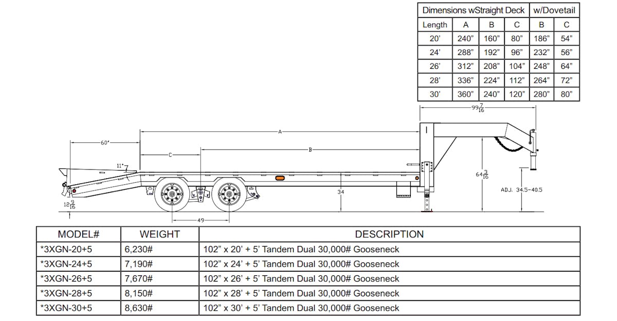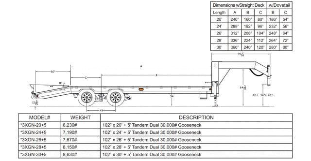 On the other side of the lineup is the 3XGN series. These all carry a 30,000 lbs GVWR rating. They too come in the 20’ plus 5’ tail to 30’ plus 5’ tail. These are tandem axles with dual wheels. To handle the increased load, the frame, cross-members and side rails are all made with larger steel pieces. So, the base weights are, also, heavier. The base weight of the 20’+5’ trailer is 6,230 lbs and the 30’+5’ come in at a whopping 8,630 lbs. So, these super duty gooseneck trailers are capable of carrying a load of 21,370 lbs up to 23,770 lbs.