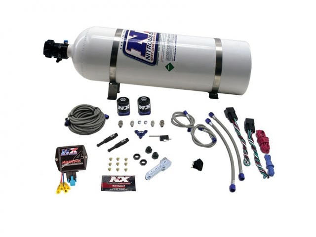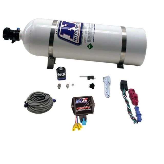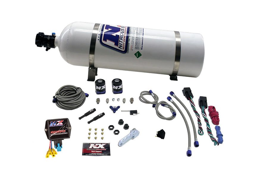 Nitrous Express has two “diesel” kits available with the Maximizer 4 controller. There is a single stage NXD1000 and a two stage system NXD4000. These systems come with a 15 lb bottle, -6 feed line, nozzles, solenoids and pretty much everything you need to start making more power.