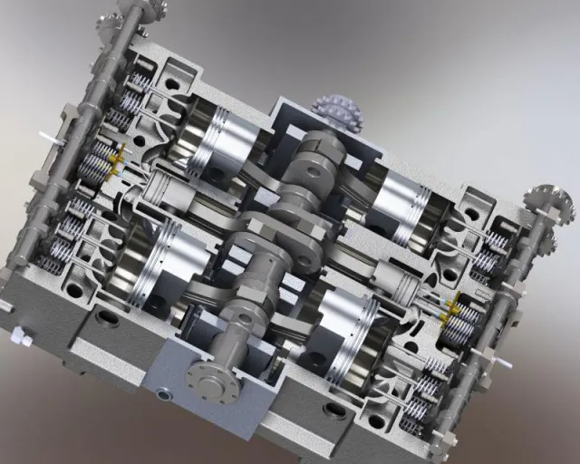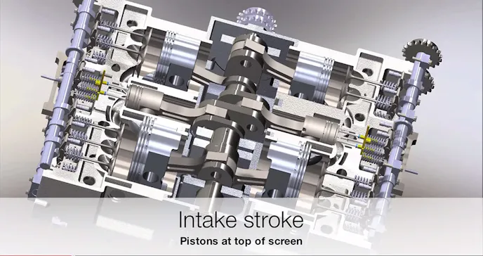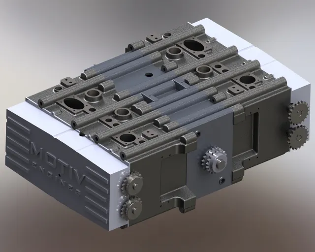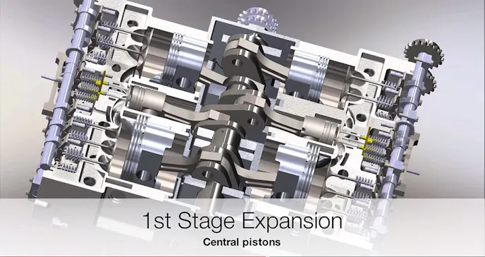 With this design, Motiv Engines’ has created a 4 stroke engine that fires every revolution like a 2 stroke engine. This is thanks to the two compression cylinders per single combustion cylinder.